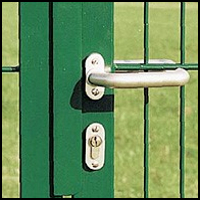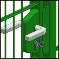 Einsteckzylinderschloß Vario-S mit Riegel und Falle (mit eloxierten Drückern und Rosetten) | Der Bodenriegel trägt entscheidend zur Unfallverhütung bei, denn er ist in den Torrahmen integriert und bei geschlossenem Tor gesperrt und nicht zugänglich. |